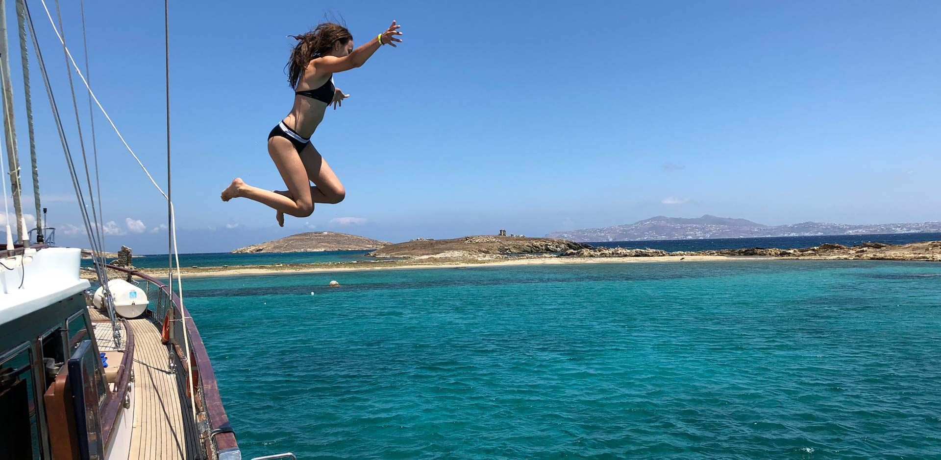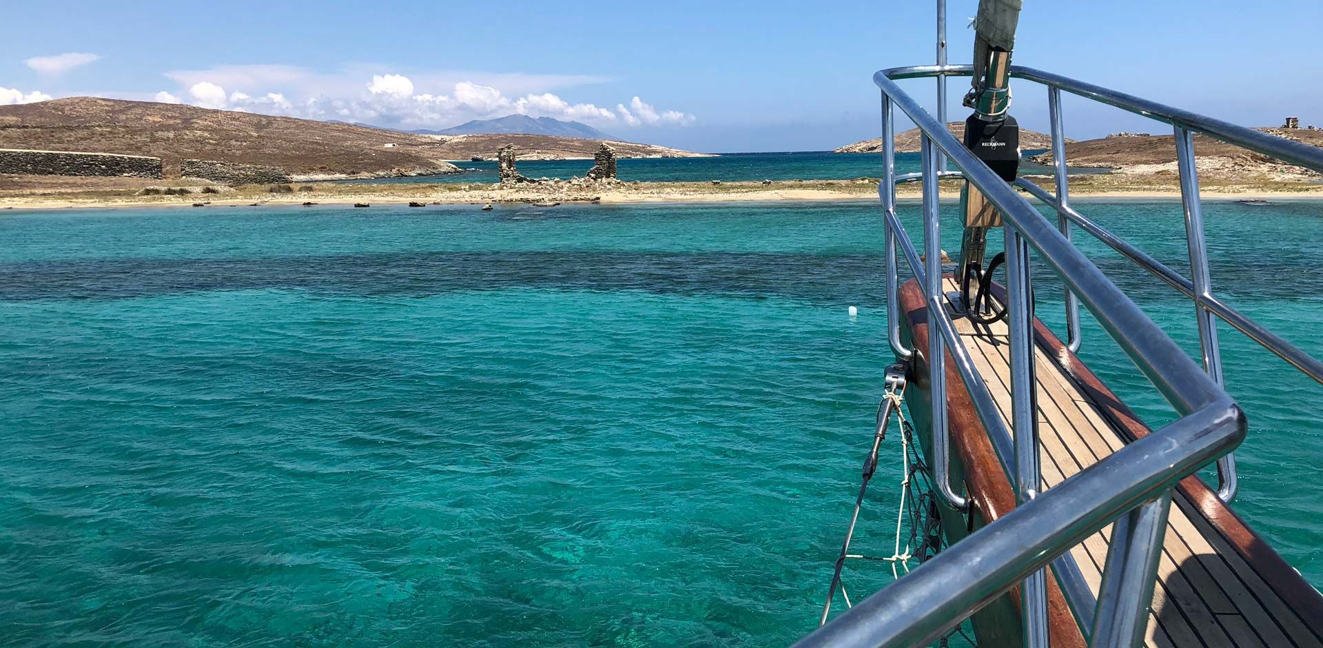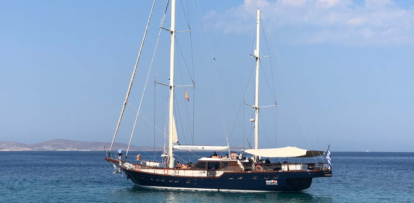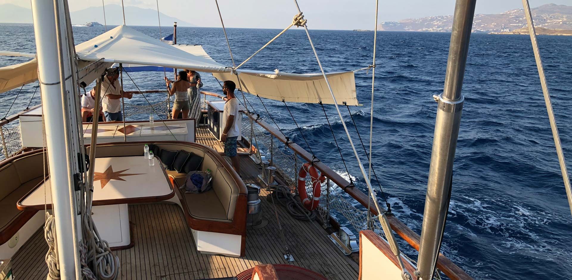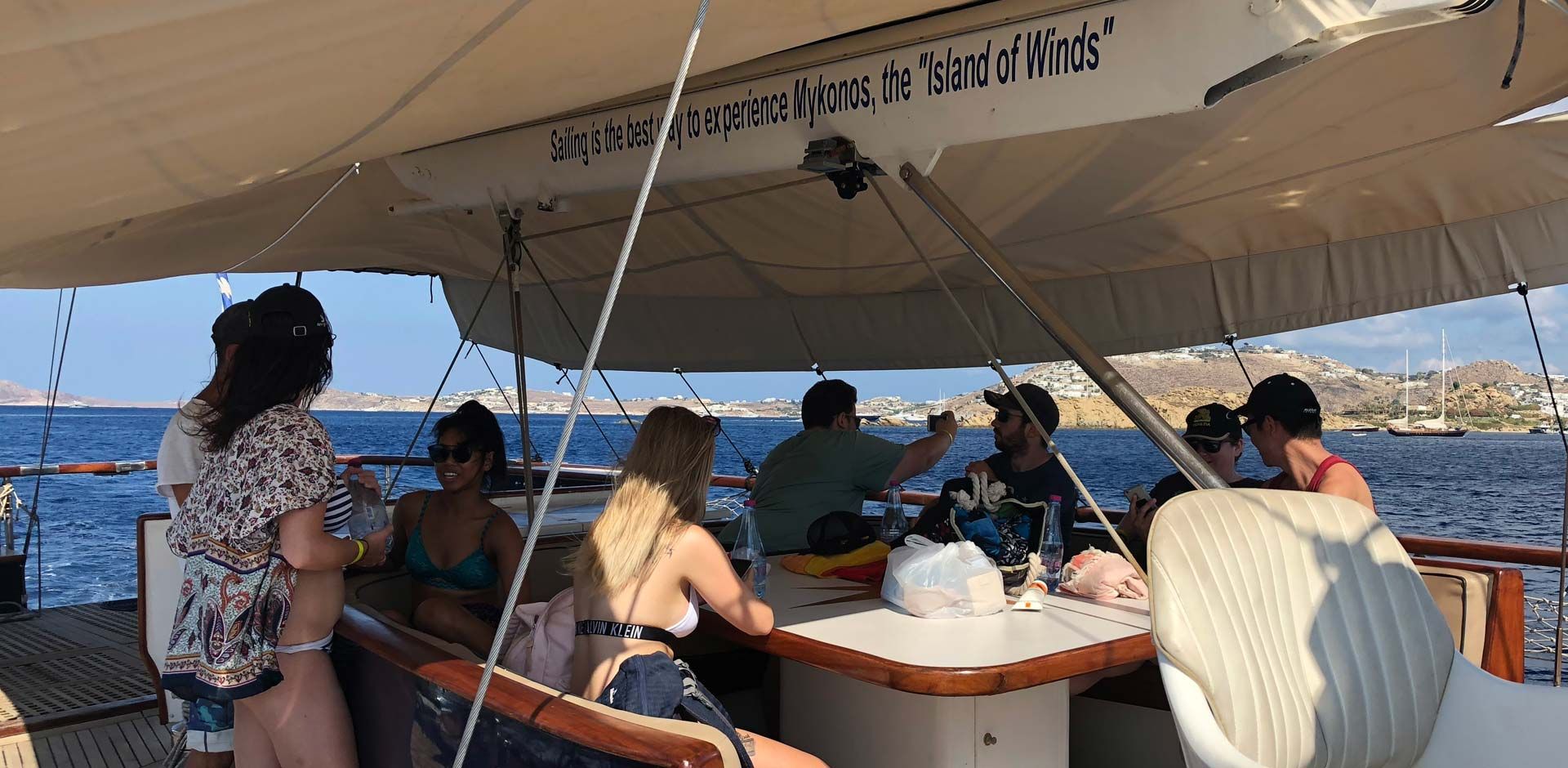 Mykonos is nicknamed “Island of Winds”. The Cyclades - the complex of islands where Mykonos belongs to - have been geographically shaped from the phenomenon of wind called “Meltemi”. Every summer the low barometric pressure from the Balkans clashes with the higher hot blasts from Africa and in this way the north wind of “Meltemi” is formed. Thus, the wind in Mykonos is completely normal and part of the lifestyle of both locals and visitors. It will ultimately leave its mark on your own Mykonos holiday album. According to the weather during the cruise, the selected beaches for swimming are the most protected ones and less windy. After all, this is also the experience of being on a sailing yacht, setting the sails to the wind needed as it is the primary engine power. Occasionally during the season there might not be enough wind or the convenient wind direction to set sails and only in such cases, the sailing route will be motorized.