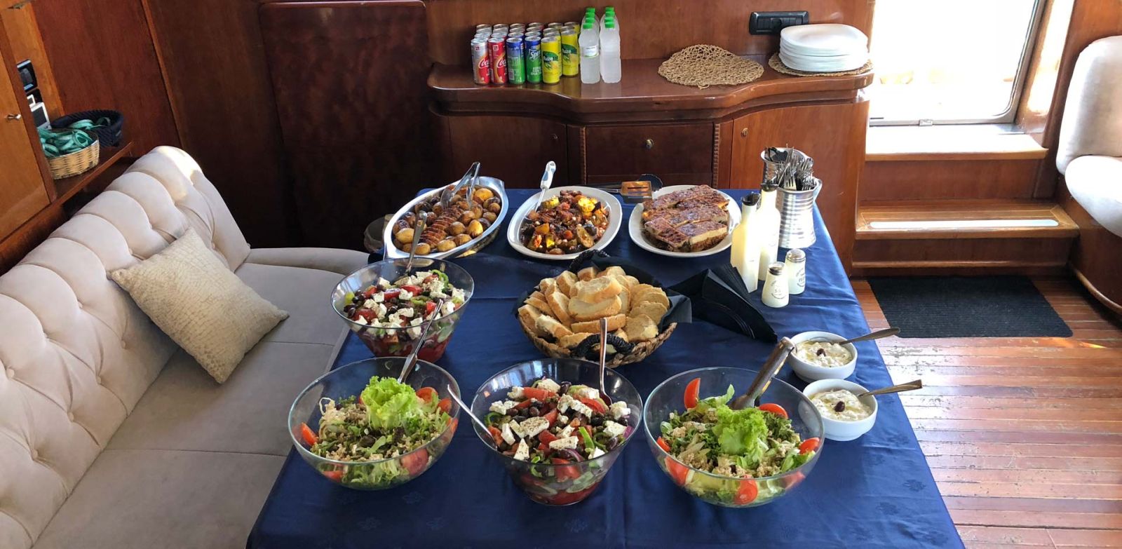 A wonderfully spacious outdoor environment on board the 112-foot long motor-sailer yacht allows you to never feel confined and enjoy sunbathing on comfortable deck cushions. Tends for shadow from the sun are also available. A feast of traditional Greek flavours for lunch is served on a Mediterranean style seated buffet with aromatic flowing wine, beers and soft drinks.