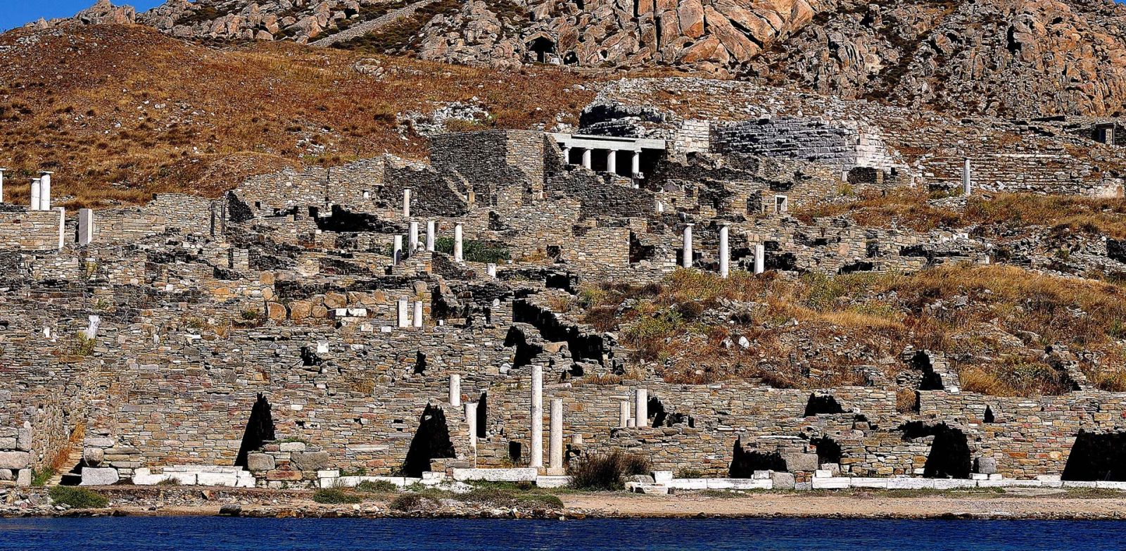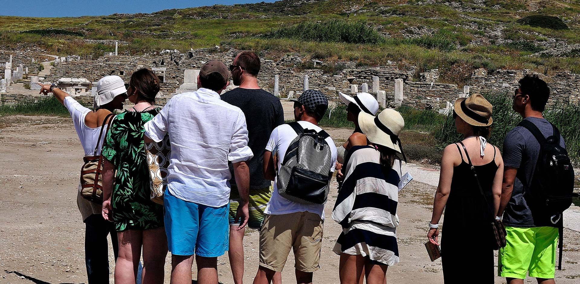 The dress code for the Delos tour is modest and respectful of the sacred site. It is recommended to wear walk shorts, pants, or t-shirts. Comfortable, closed, non-slip shoes are essential for exploring the site safely. Do not forget to bring a sun hat, sunglasses, sunscreen and long sleeves for protection, as Delos is known for being one of the sunniest and brightest places on Earth — it is the birthplace of Apollo, after all!