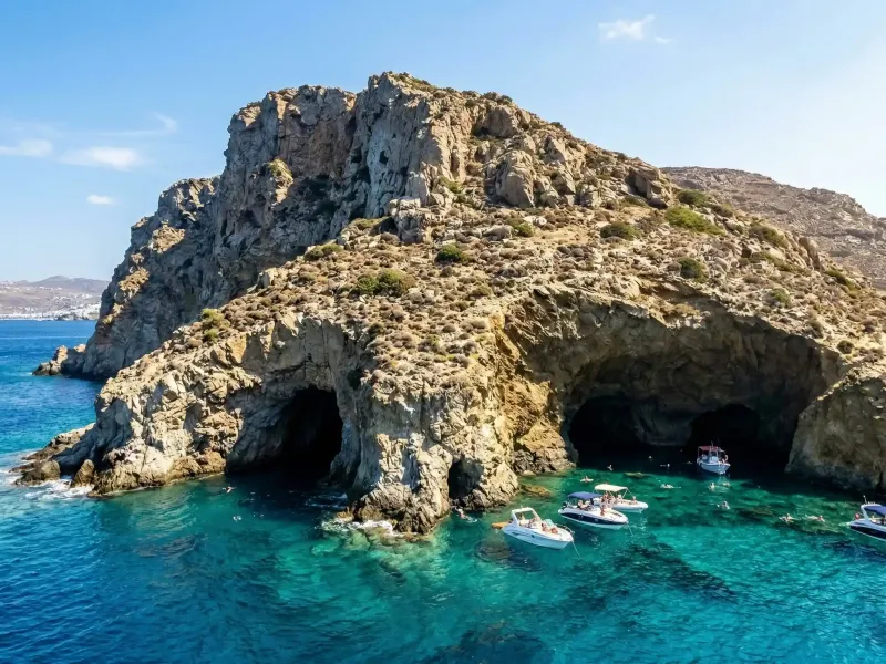 Southeast of Mykonos lies Dragonisi, an uninhabited nature reserve and a rugged jewel of the Cycladic landscape, protected by the Natura 2000 network. This islet is renowned for its dramatic cliffs and striking rock formations, surrounded by crystal-clear emerald waters. Beneath the surface, a fascinating world of sea caves and underwater chambers awaits, while the area serves as a vital habitat for protected underwater life, including yellow sea anemones, dolphins, sea turtles and the rare Mediterranean monk seal.