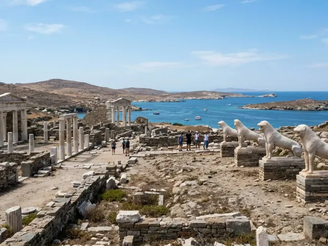 A short sail from Mykonos lies Delos, a UNESCO World Heritage treasure and the legendary birthplace of the twin gods Apollo and Artemis. This 7-km-long island, inhabited from 2500 to 69 BC, was renowned as both a major religious center and a thriving commercial hub. Today, this uninhabited sanctuary stands as an open-air museum, where marble temples, intricate mosaics and an ancient theater reflect its remarkable past offering visitors an evocative journey into the sacred roots of the Mediterranean.